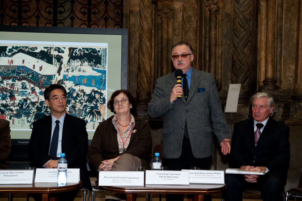 Церемония открытия персональной выставки гравюр Куниёси коллекционера и писателя Александра Орлова-Кретчмера в музее им. А.С. Пушкина вместе с послами Японии в России и России в Японии. 2009