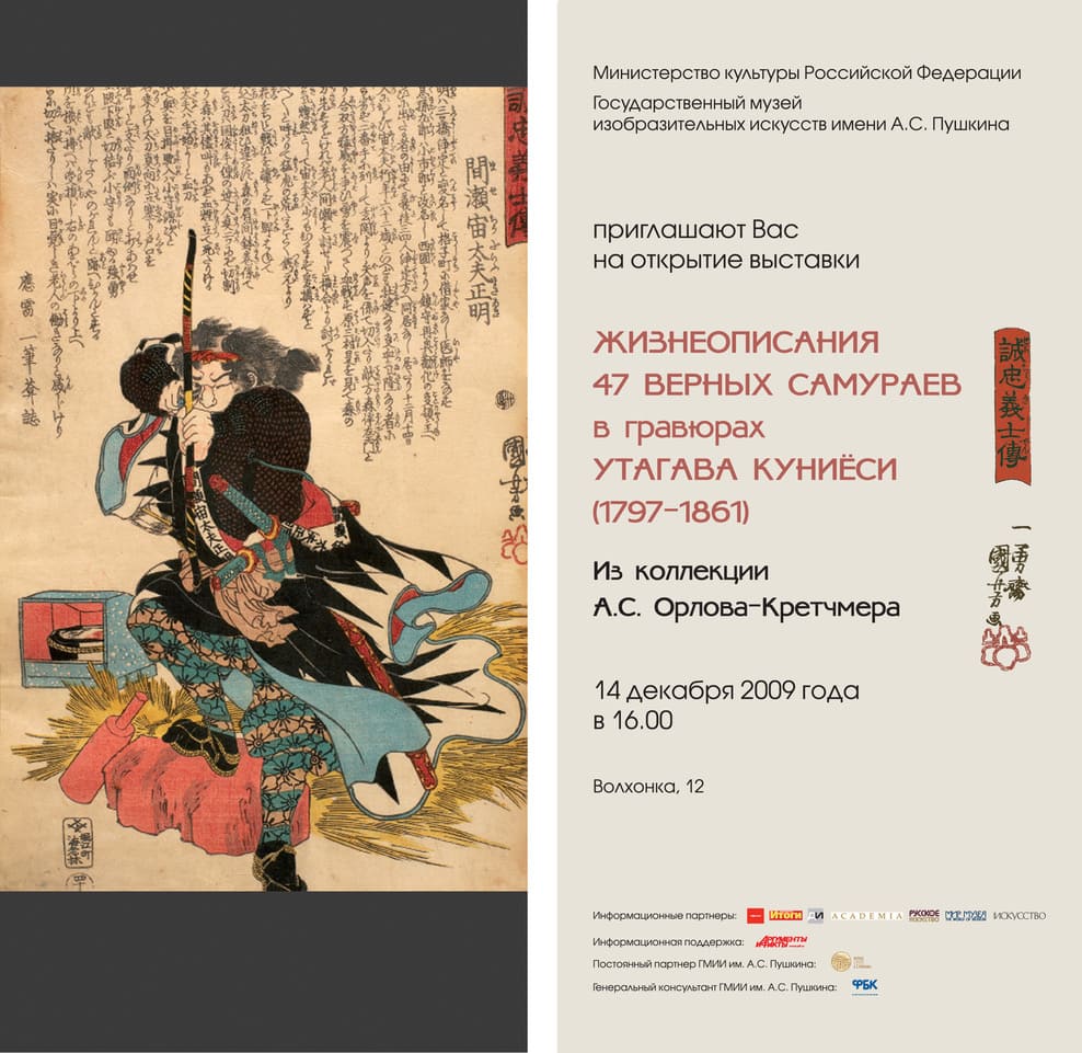 …Собрание ксилографий японского графика первой половины XIX столетия Итиюсая Куниеси (1798–1861), составленно из широко известной серии работ художника «Сэйтю гисидэн» (в переводе «Верные вассалы. Образы ронинов»; известен также перевод: «Жизнеописание преданных и верных вассалов»). Серия посвящена сакральному для японцев историческому эпизоду начала XVIII в., послужившему источником для созданию целого пласта произведений японской и мировой культуры – героическому поступку группы телохранителей-ронинов из древней столицы страны Ако. В мировой культуре это событие известна как «История о 47 ронинах». Художественный жанр с изображением воинов-самураев получил на родине название муся-э и стал визуальной квинтэссенцией воинского духа чести японских самураев, – бусидо. Серия «Сэйтю гисидэн» общепризнанно превратилась в самое популярное в мире художественное описание самураев. Работы представляют собой аутентичные авторские цветные ксилографии небольшого тиража на рисовой бумаге. Листы представляют литературно-художественный симбиоз: на каждом листе приведено выразительное описание изображенного события известного литератора того времени Иппицуана. Это была предсмертная совместная работа литератора со своим соавтором, художником Куниеси. Бумажные листы не предназначались для длительного хранения и за прошедшие полтора столетия практически все экземпляры ксилографий пришли в негодность или исчезли. Попытки собрать коллекции из листов серии стали предприниматься в Европе уже с первых десятилетий XX в. Известны несколько собраний, имеющих мировое значение, экспонируемых в известных музеях, где представлено японское искусство: Yokoyama Arts & Crafts, Antiques Cornalia Gallery, музей Куниеси (Япония), The Akasaka Collection, The Art Institute of Chicago, Museum of Fine Arts (США), Japanese Gallery, Victoria-Albert Museum (Великобритания), National Museum of Ethnology (Нидерланды). В России листы серии Куниеси имеются в собрании Эрмитажа (в ней 47 листов), ГМИИ им. А.С. Пушкина и Музее народов Востока (в этих собраниях есть отдельные листы серии). Из частных собраний известны коллекции К. Бекингема (США), Б. Робинсона (Великобритания). Собрание А. Орлова-Кретчмера является самым полным среди известных мировых коллекций. В декабре–феврале 2009 г. собрание ксилографий было впервые выставлено для публичного ознакомления в ГМИИ им. А.С. Пушкина, где с большим успехом экспонировалось в зале Греческого дворика Главного корпуса музея. Известны четыре каталога с описание работ серии «Сэйтю гисидэн»: каталог известного коллекционера и знатока Бэзила Робинсона (Kuniyoshi: the Warrior Prints; 1982); книга М.В. Успенского (Самураи Восточной столицы; 1997) с частичным переводом текстов ксилографий на русский язык; каталог известного искусствоведа Дэвида Вайнберга (Kuniyoshi, the Faithful Samurai; 2000) и каталог А.С. Орлова-Кретчмера (Эстетика возмездия самурая; 2009). В последнем каталоге дано описание всех листов полного комплекта серии. Кроме того, в последнем каталоге приведены литературные переводы всех текстов Иппицуана на русский язык…