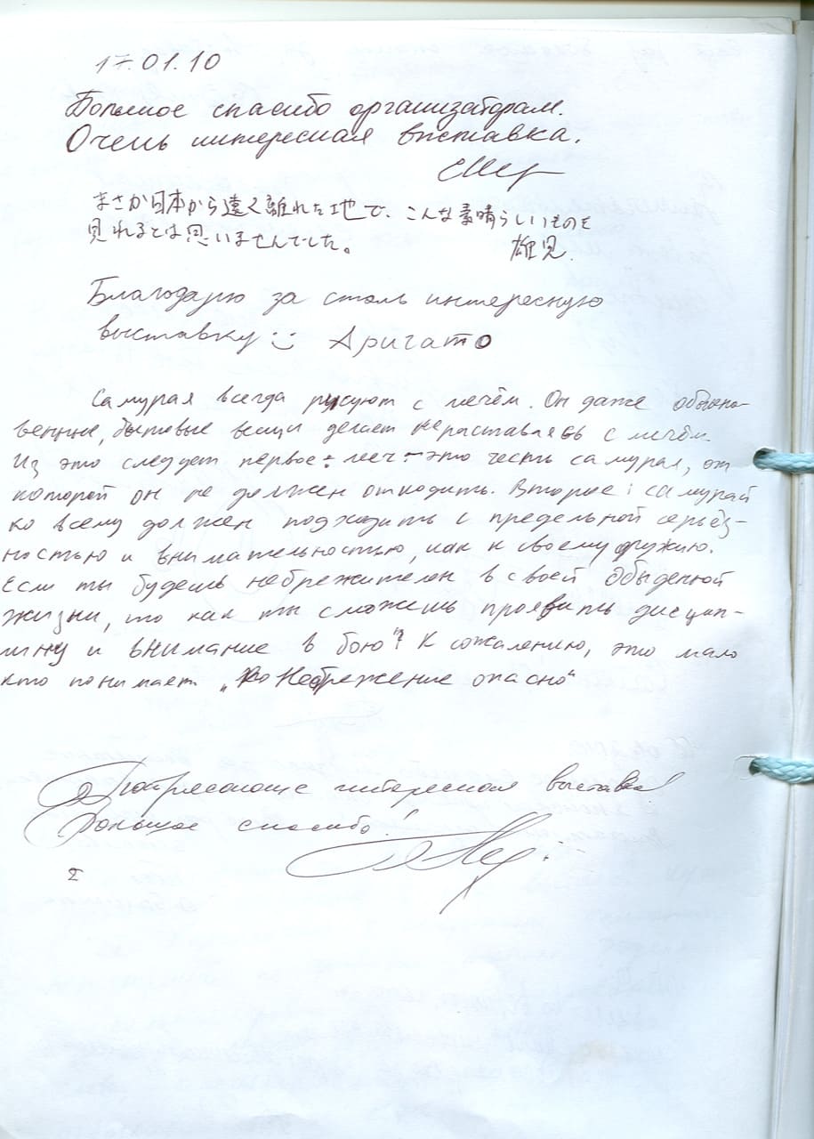 Анна-Эва Михальская (профессор, литературовед, Москва): Я так была поражена, что мой сын купил Вашу книгу «Эстетика возмездия самурая» (он живет в Японии часто и подолгу, друзья у него японцы, говорит и пишет по-японски и, по-моему, все знает о Японии), и что эта книга вдруг оказалась со знакомым именем на обложке, да еще на такую тему, да еще представляет такую коллекцию, что нарушила кодекс чести отношения к книге и прямо вот так, в коридоре, стала читать! Я и не думала, что и самураи Вас подвигли на такой прекрасный труд! Спасибо, Александр Сергеевич!